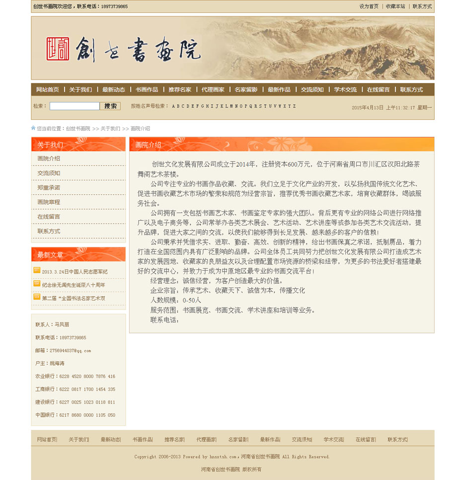 案例介紹:創(chuàng)世文化發(fā)展有限公司成立于2014年,注冊資本600萬元,位于河南省周口市川匯區(qū)漢陽北路茶舞閣藝術(shù)茶樓公司專注專業(yè)的書畫作品收藏、交流。我們立足于文化產(chǎn)業(yè)的開發(fā),以弘揚(yáng)我國傳統(tǒng)文化藝術(shù)、促進(jìn)書畫收藏藝術(shù)市場的繁榮和規(guī)范為經(jīng)營宗旨,推薦優(yōu)秀書畫收藏藝術(shù)家,培育收藏群體,竭誠服務(wù)社會。